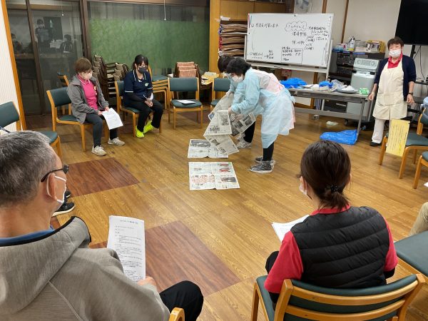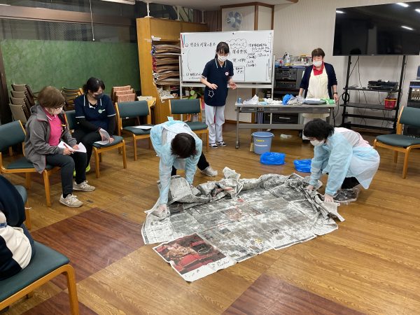 看護師さんを先生にして、感染症への知識を深め、嘔吐処理の実践的なシュミレーションも行いました。
