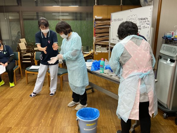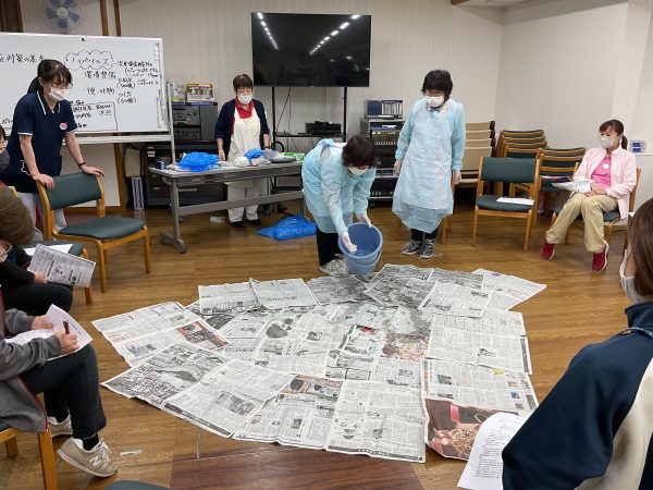看護師さんを先生にして、感染症への知識を深め、嘔吐処理の実践的なシュミレーションも行いました。