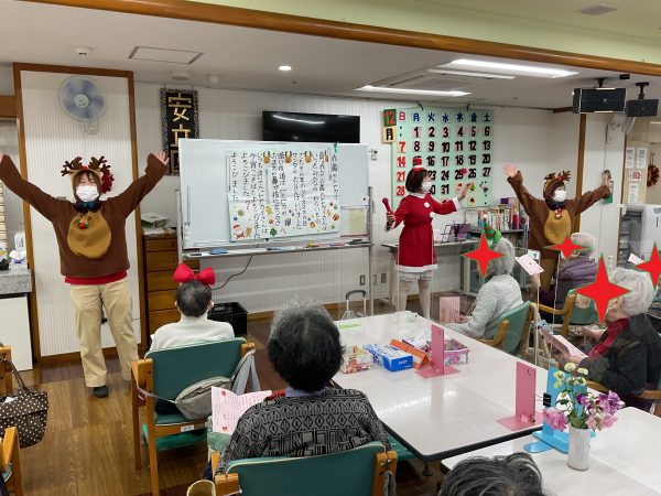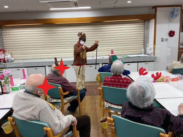 コミカルなトナカイは、今年も「スキー」ではご利用者様の杖を拝借し、軽快に踊らせていただきました😁💖