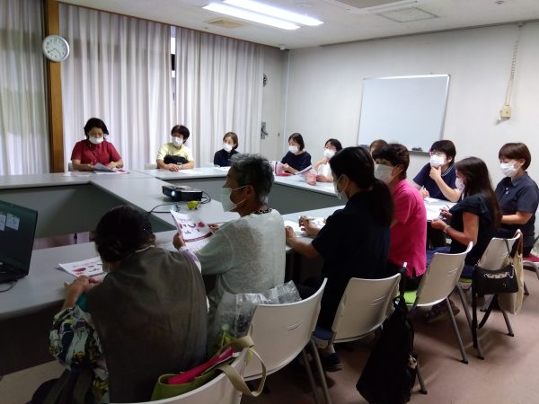 健康な体作りのために、一日に何をどのくらい食べたらいいのか、手のひらをはかりにして量る方法や口腔体操などスライドを見ながら楽しい研修になりました。