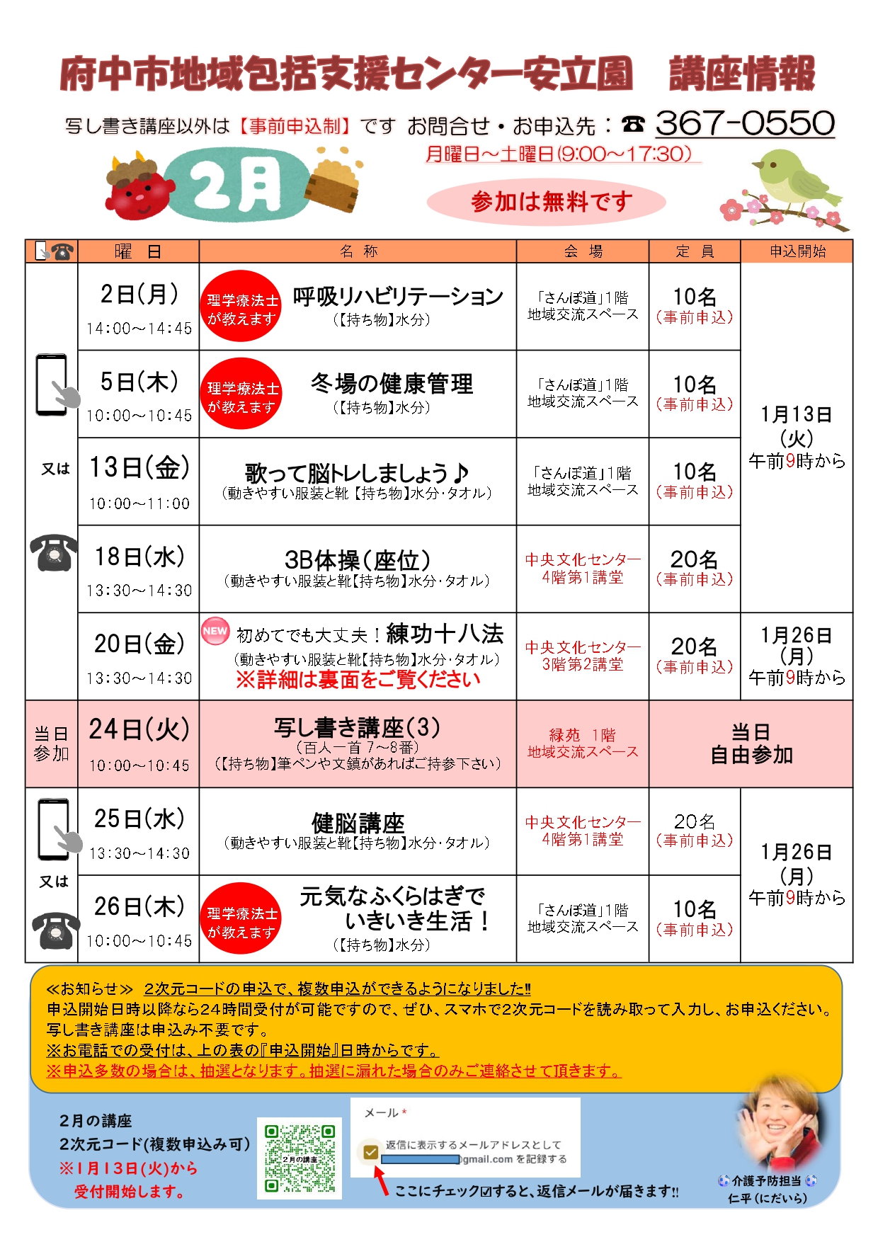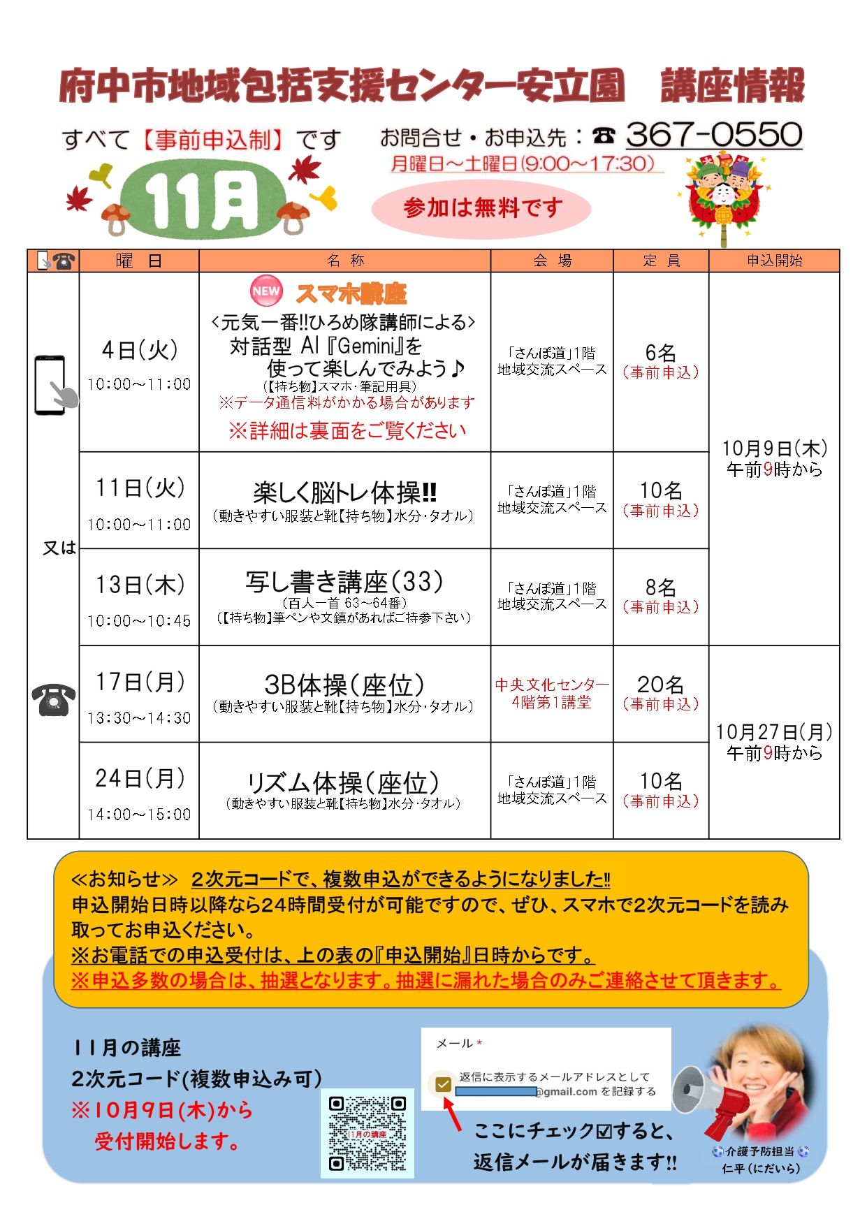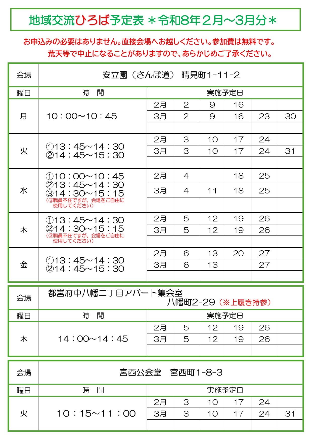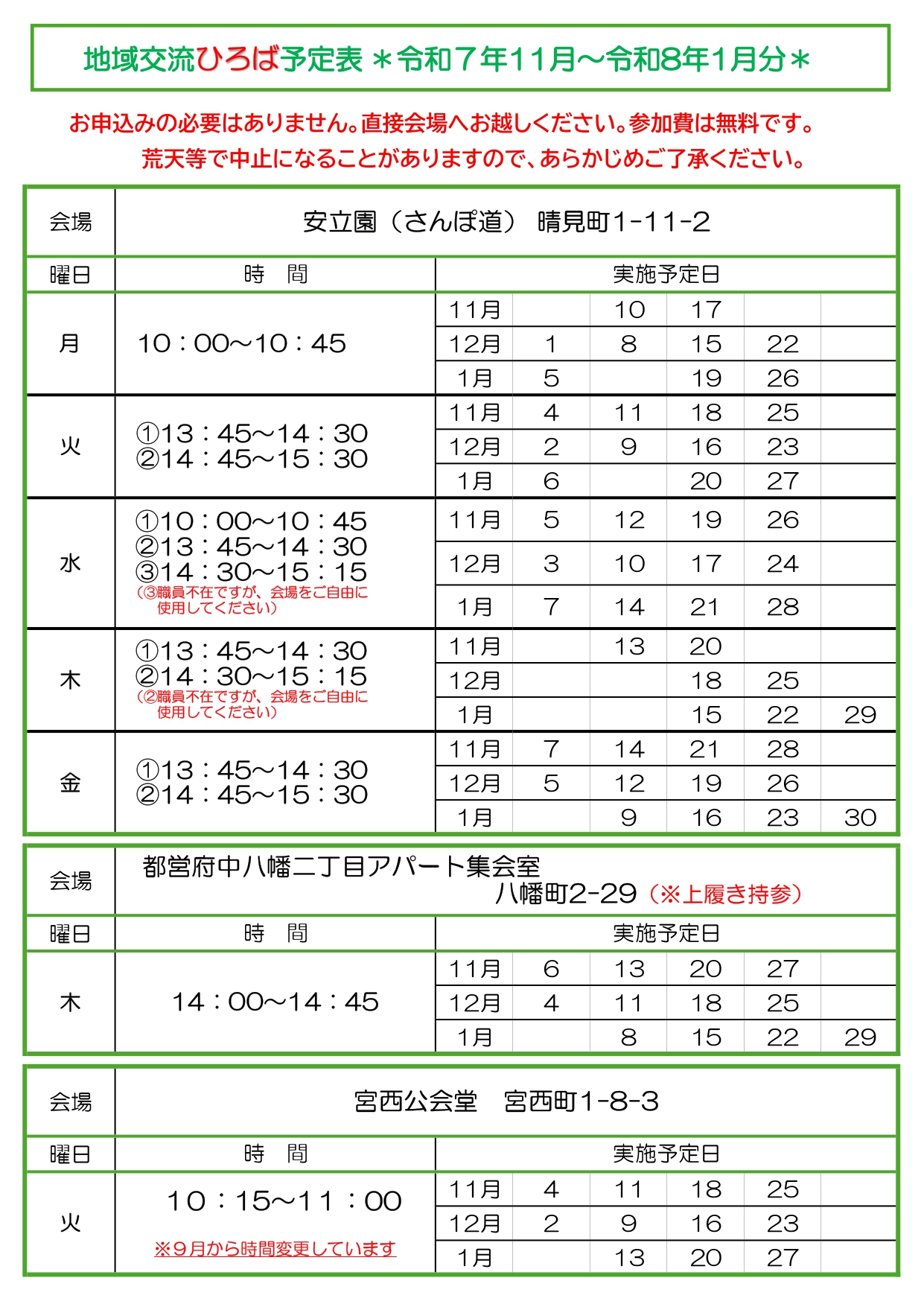 「元気アップ体操」や「元気一番!!ふちゅう体操」を、参加された皆様でおこない、運動習慣を継続していただける場です。体操のCD音源が準備されていますので、集まった皆様で、気軽におこなえます。地域の中での「新しい交流の機会」となり、更には「お仲間同士で好きな活動をする」きっかけになればと思います。65歳以上の府中市民の方なら、どなたでも何度でも参加可能です。(職員は円滑に進むようお手伝いをいたします)(利用料無料) ※基本は自由参加ですが、コロナ禍では事前申込み制
