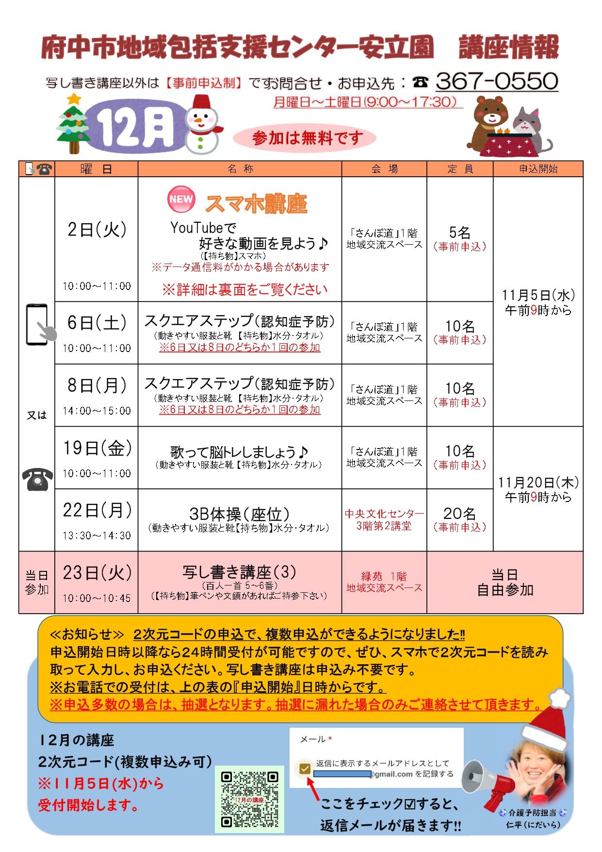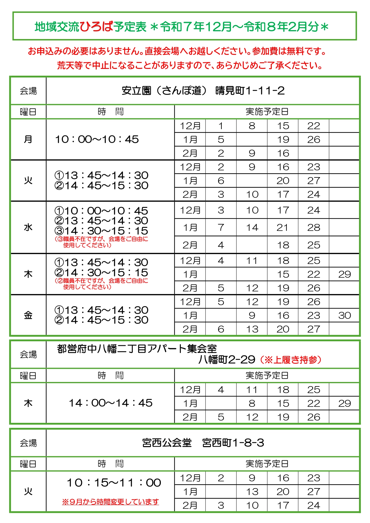 「元気アップ体操」や「元気一番!!ふちゅう体操」を、参加された皆様でおこない、運動習慣を継続していただける場です。体操のCD音源が準備されていますので、集まった皆様で、気軽におこなえます。地域の中での「新しい交流の機会」となり、更には「お仲間同士で好きな活動をする」きっかけになればと思います。65歳以上の府中市民の方なら、どなたでも何度でも参加可能です。(職員は円滑に進むようお手伝いをいたします)(利用料無料) ※基本は自由参加ですが、コロナ禍では事前申込み制